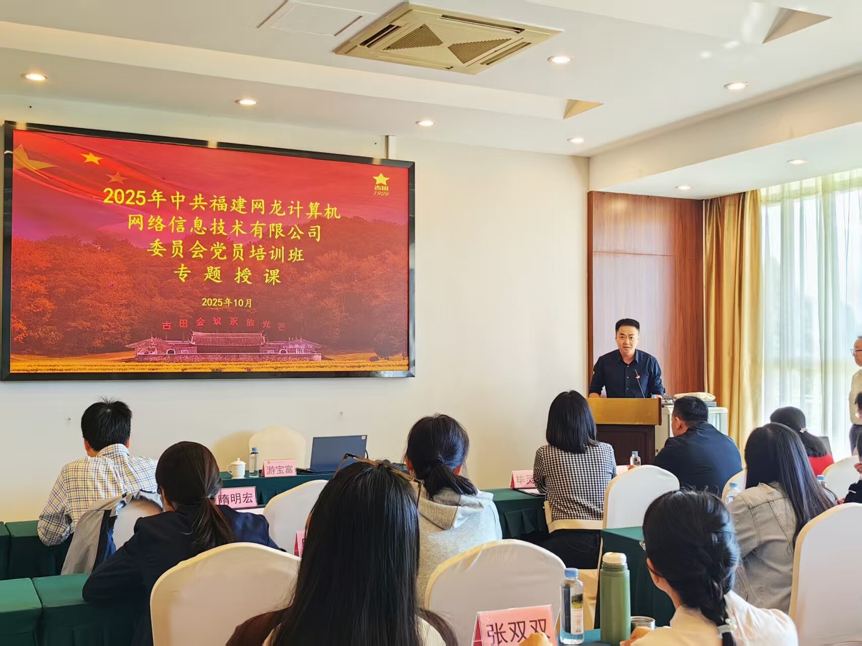 25日,活动在古田山庄庄重的开班仪式中拉开序幕。受党委副书记郑毅铖同志委托,党委委员隋明宏同志发表讲话,他首先传达了郑毅铖同志对本次学习的具体要求:一是要严守学习纪律,珍惜赴革命圣地学习机会,沉心悟史、汲取养分,杜绝形式主义;二是要聚焦 “传承古田会议精神、提升党务工作能力” 目标,思考 “思想建党、政治建军” 原则的实践转化路径;三是要推动学习成果与网龙党建实际结合,破解工作难点,以高质量党建引领企业发展。隋明宏同志强调,全体党员要带着敬畏心学党史、带着思考悟精神,确保学有所获、行有所成。