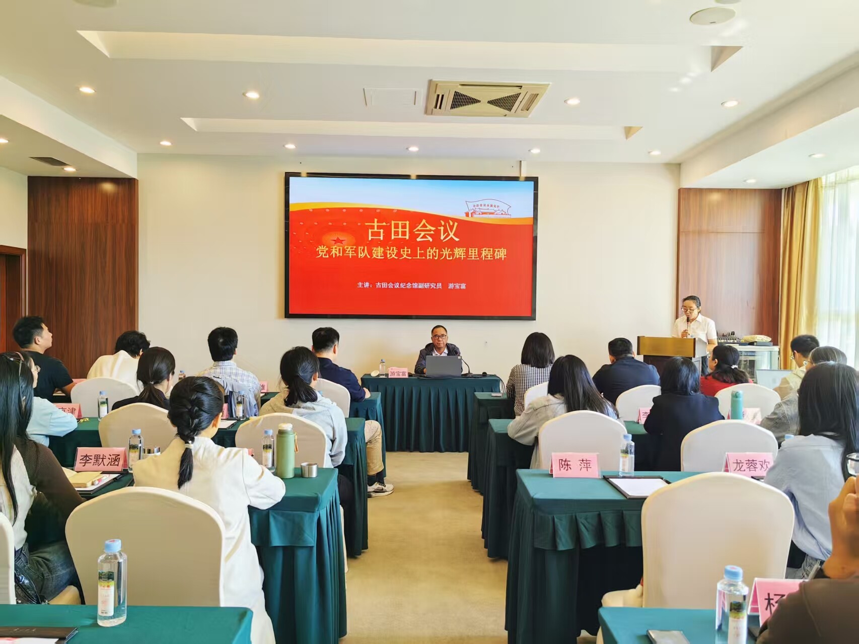开班仪式后,古田会议纪念馆副研究员游宝富教授以《古田会议—— 党和军队建设史上的光辉里程碑》为题授课。他结合史实,讲述古田会议背景,解读古田会议精神,强调 “思想建党、政治建军” 之核心,点明会议第一次为革命军队的建设指明了方向、第一次树立了开展党内思想斗争和加强思想建设工作的良好典范等意义。通俗易懂的讲解,让原本厚重的历史变得可感可知,使全体党员对古田会议有了深刻且清晰的认识。